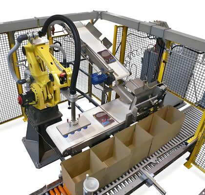 Questo sistema è stato progettato per l'imballaggio automatico di scatole di cartone, bottiglie di vino, lattine metalliche e contenitori di plastica.attrezzature, e un armadietto di controllo principale. Può essere integrato senza soluzione di continuità con erettori di cartone, sigillatori di cartone e palettizzatori per creare una linea di produzione completamente automatizzata.
